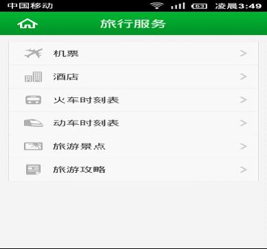 “欣欣旅游线路”客户端除了预定线路这一核心功能外,还有另外一项受游客喜爱的功能:旅行服务。在这里有机票、酒店的链接预定;也有火车时刻表、动车时刻表的查询服务;还有旅游景点信息查询和旅游攻略查询,是一个十足的掌中百宝箱。