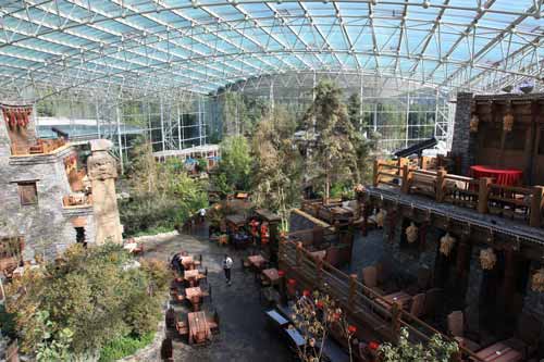 九寨天堂洲际大饭店栖落在九寨原始森林里,犹如一只飘逸的白鸟,远看昂然扩首,展翅欲飞;近看优雅落栖,挺拔俏丽。这座由钢拱架全透明玻璃,高居山峦之上,独特的设计使之形如一个在玻璃中庭保护之下的古老城堡,一切的林中逸事,优雅游记,浪漫故事都在此上演,而背景正是九寨山水这神奇的人间仙境。