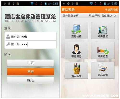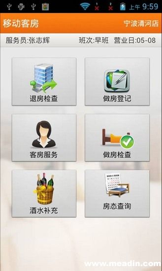 由其自主开发的客房移动管理系统在连接网络后,主界面显示的主要是六个功能模块,退房检查、做房登记、酒水补充、做房检查、客房服务、房态查询,能让客房管理员在移动工作过程中可实现轻松查找住客房退房检查记录、检查设施设备状态、易耗用品使用情况、了解房态、为宾客提供其所需的服务。