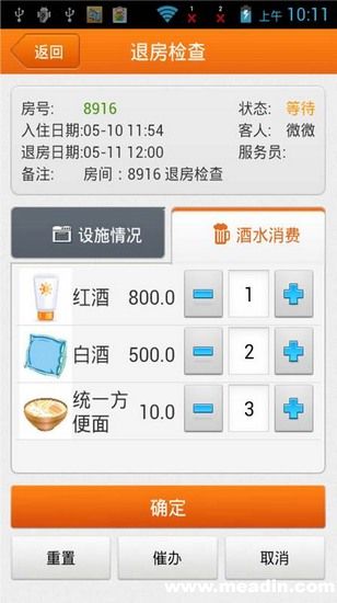 据了解,该系统已与酒店PMS系统对接。酒店前台操作时,客房服务员可在第一时间收到消息,并查找实时记录。如退房检查功能,当前台退房时,会通过系统操作,将指定房间的退房检查信息发送到值台处,值台在任务栏处接收到指定房间的退房检查信息,点击此条信息,即可进入指定房间的退房检查详细界面并进行相应的操作。而退房检查详细界面则会显示“设施情况”与“酒水消费”两个条框,检房员根据房间的实际情况进行填报,填报信息会发送至前台,由前台最后与客人确认查房情况,进行入帐与结账。