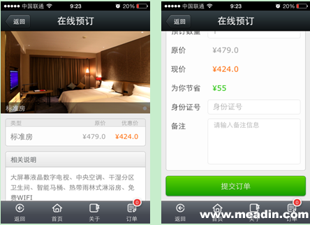 用户添加完公众账号后,便可看到三碧酒店微 信菜单界面,主菜单有关于三碧(酒店介绍)、B优会(会员专区)、最新活动三大功能。点击B优会,进入微预订操作界面,通过清晰、明快、完整的功能设置,用户便可以根据自己的需求,选择入住的三碧酒店、查看房价等,随后点击想要入住的房型,完善资料并下单。实际操作简单、易懂。