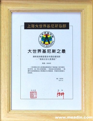 2014年1月,经上海大世界基尼斯总部认证,美丽之冠七星酒店建筑群获得大世界基尼斯之最,是世界上拥有客房数量最多的酒店建筑群。