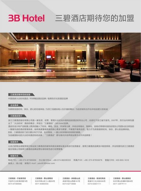 2014年伊始,酒店加盟的新一轮热潮袭来,多家中档酒店品牌加入混战中。而年后,加盟商的目标比往年更加明确,瞄准中档的大众时尚精品酒店的前景变得更为明朗,其中以浙江三碧酒店股份有限公司旗下的三碧(3B Hotel)酒店品牌尤为吸引加盟商的注意。