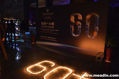 今年,中国区地球一小时的主题定为蓝天自造,为响应这一号召,万达酒店及度假村制定了“关一盏灯 蓝一片天”的公益活动,旗下各品牌酒店于“地球一小时”期间采取一系列节能措施,如:关闭全部外墙灯光及室内非必要照明灯光、调暗大堂及餐厅灯光,并使用蜡烛照明、关闭无人办公区域的空调和照明设备关闭喷泉、水幕等喷水装饰,并通过电梯电子屏、客房内的电视和欢迎信向宾客宣传“地球一小时”所倡导的环保理念。