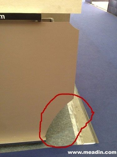 4) 通过现场目测,同位置的上方已有一块破损(图1右上角),另一方向走道的一块瓷砖也有破损(图3右下角),同样问题出现在同一家展台,参展商设计上面明显存在缺陷。而其他参展商类似型材均有背板保护,避免碰坏。