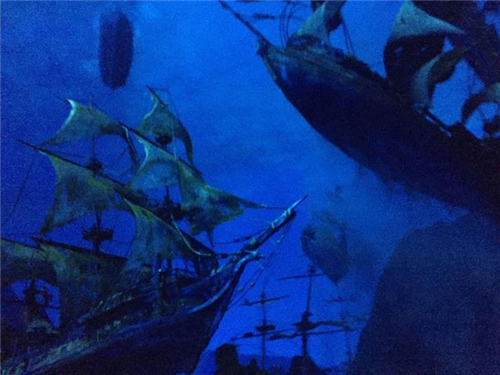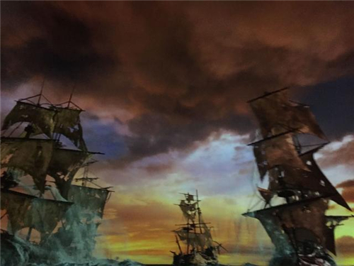这是迪士尼幻想工程师们有史以来设计过的最复杂的游乐项目之一。即使是对于看惯了巨幕电影的现代观众来说,它也足够震撼。尤其是在高潮的海战部分,游客的面前会出现一幅巨幕,在上面映出紫红色天空下,无数艘海盗船在互相开火的画面,效果比起需要一个沉重头盔才能体验的虚拟现实有过之而无不及。