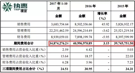此外,公司2015年度、2016年度、2017年1-10 月期间费用合计分别为3974.57万元、4099.69万元、3484.43万元,占营业收入比重分别为34.31%、30.95%、24.51%,呈逐年下降趋势。