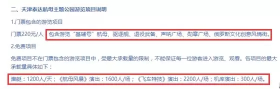 泰达航母虽然充分利用了航母这一特殊IP,融实景演艺、歌舞表演等于一体。不过在泰达航母官方公布的游览项目说明中,门票就包含了多个上述游览项目,包括游览“基辅号”航母、俄罗斯文化创意风情街等、航母风暴、飞车特技等,游客二次消费尚未充分挖掘。