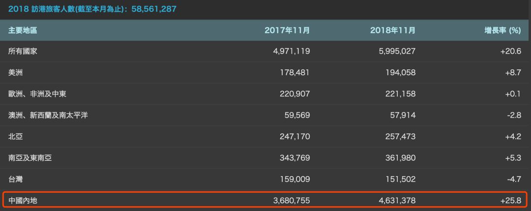 香港旅游发展局发布的最新访客数据显示,2018年11月,共有599万名访客来港,比去年同期增加了20.6%,其中内地访客人数增幅最大,同比增长25.8%至463万人次。