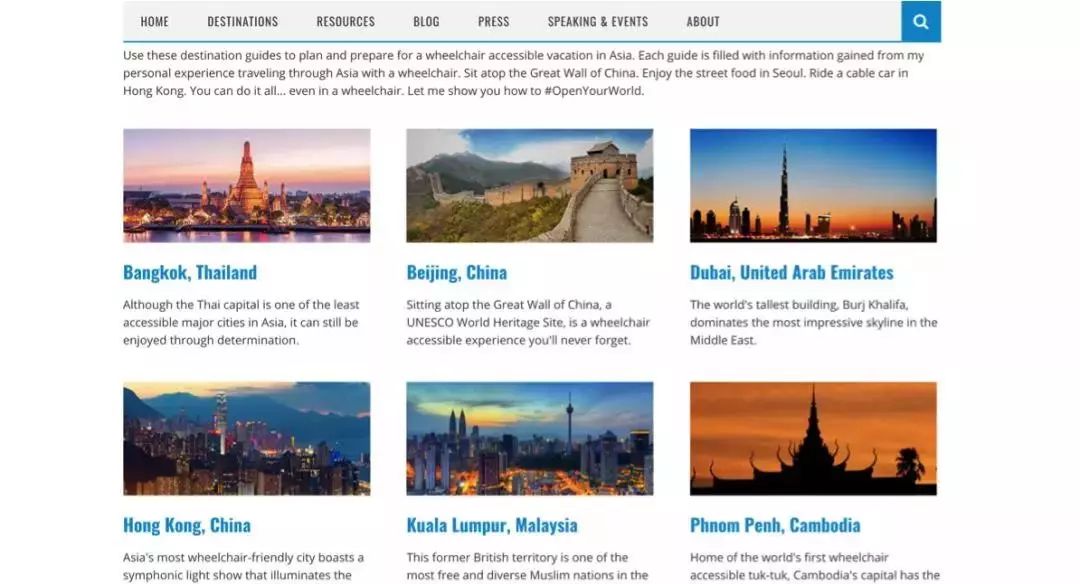 我们还可以在旅行博主那里找到相关的信息,比如说这张图显示的就是一个我经常看的残障的旅行博主写的各个城市的旅游指南。