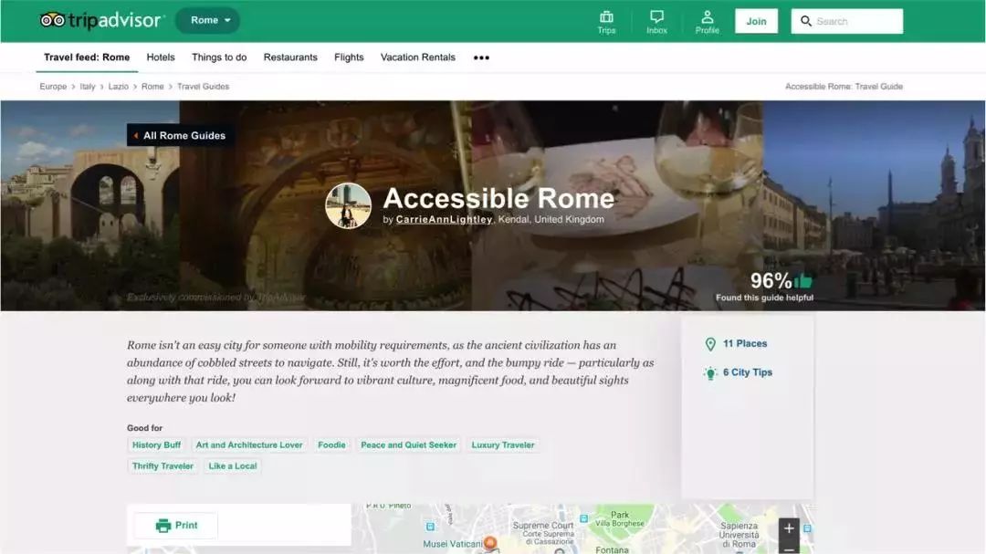 在上面我们还可以找到这个城市的无障碍指南,他们也会召集地区里经验丰富的残障旅行者,来撰写这样的无障碍城市指南,特别是本地吃喝玩乐的信息,也就是旅游景点、网红餐厅之类的信息。