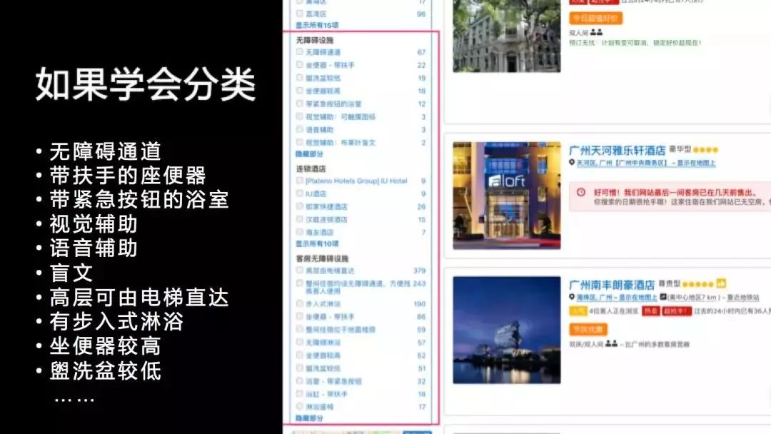 同样我在一个国外的OTA上查找广州的住宿的时候,我发现了这样一些信息,在他们的无障碍设施的分类底下又有十几个小的分类,比如说这里有没有无障碍通道,有没有带扶手的坐便器,有没有直达的电梯,有没有步入式的淋浴,有没有盲文或者语音的辅助。