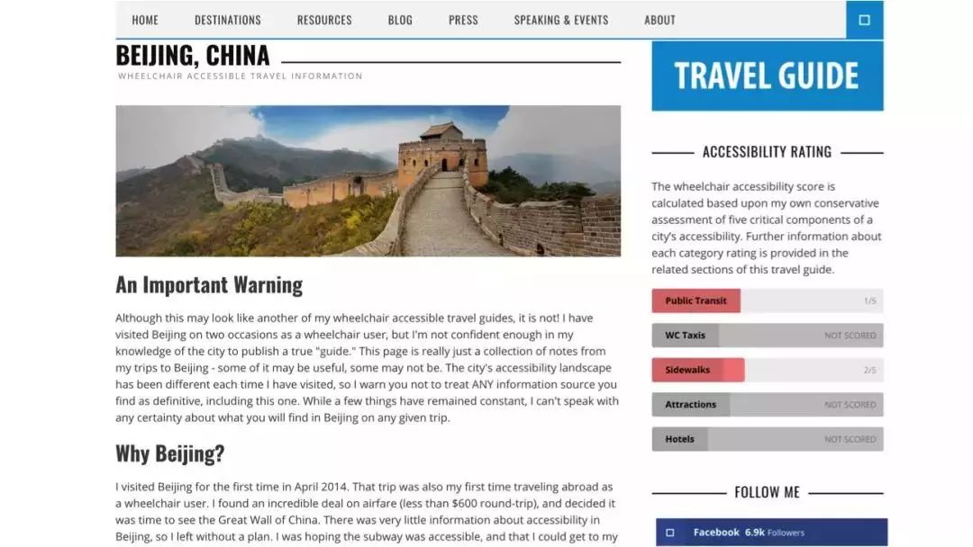 他们提供的信息会更加地个人化,因为他们在表达的是自己对这个城市的感受。所以我就非常好奇地翻开了他写的中国北京的无障碍的测评,然后就发现了如下的信息——“An Important Warning”,重要警告。