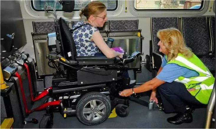 当有轮椅使用者要上车的时候,公交车司机会让其他乘客在一旁等候,让轮椅乘客先上车。轮椅乘客上车了以后,司机会五花大绑地把这台轮椅固定在车里,这个位置通常是位于司机位置的正后方或者右后方。