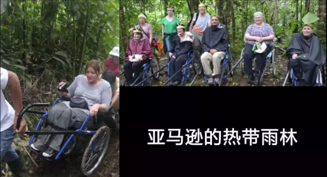 那亚马逊的热带雨林可以是无障碍的吗?当然可以,也是需要做一个轮椅的改装,就像这张图上,它把轮椅前面的两个小轮子给拆掉了,并且放上了两个伸长的扶手,这样有人可以在前面拉着这个轮椅,还有个人在后面推着轮椅,这种改装过的轮椅就可以在亚马逊的森林里面行走了,有点像我们中国的黄包车。