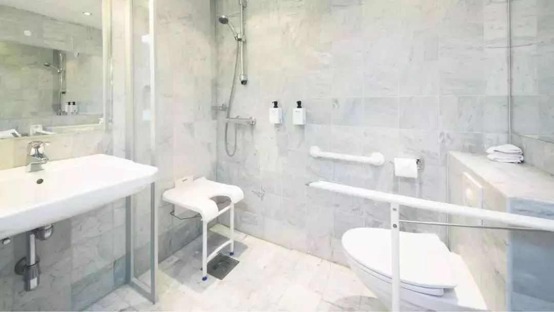 如果我喜欢用右手扶,他们就会给我安排一个坐便器的右边对着墙的房间,因为他们在右边的墙上放了一个固定的扶手。同样,如果我喜欢使用左手,他们就会给我安排一个坐便器的左边对着墙的地方。这种设计也适用于淋浴,所以很多的无障碍设计都是在细节方面体现的。