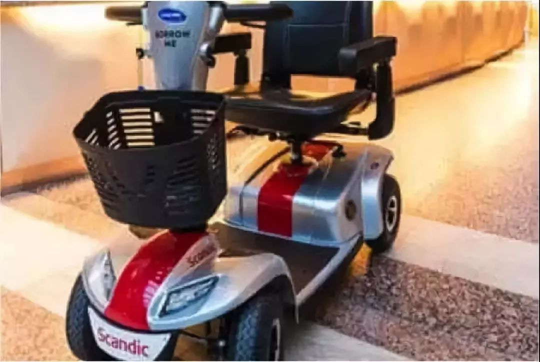 除此以外酒店还可以提供轮椅的租赁服务,像这种代步车,可能很多人也都见过,特别是老年人非常喜欢用。其实你在酒店里直接找前台租一台就行了,不用自己带。