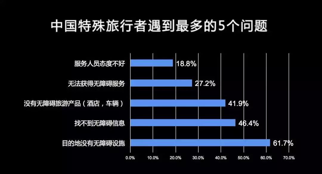 比如在我们刚才提到的中国特殊旅行者调查中,我们发现中国的旅行者遇到的最多的问题就是:目的地没有无障碍设施,找不到无障碍的信息,找不到酒店,找不到服务,而且服务人员的态度也不好。面对这样的问题到底该怎么办?很长时间以来都没有人给出一个答案。