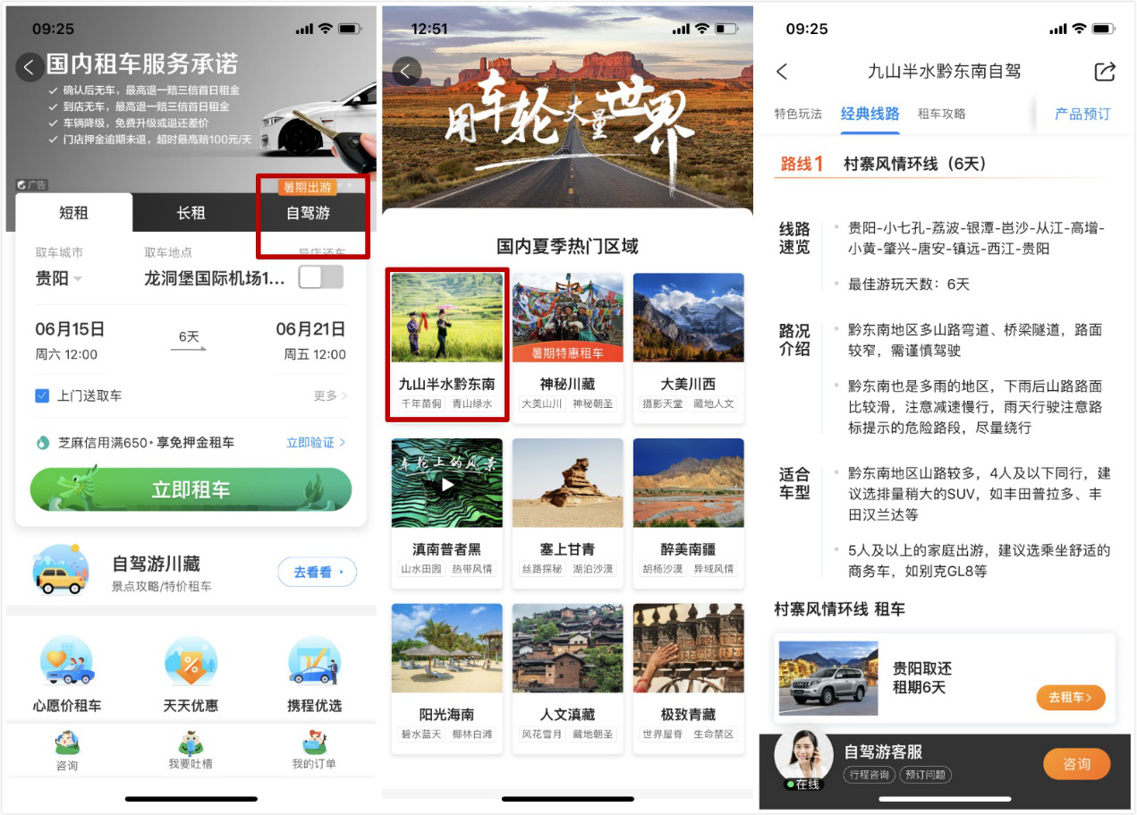 “在携程App的国内租车预订入口,我们就向用户推荐亲自去踩点过的经典自驾游线路,比如从贵阳机场取车即可出发,途径小孔桥、荔波、银潭,一路开到高增、唐安、镇远,最后再从西江回到贵阳。”彭廷表示。