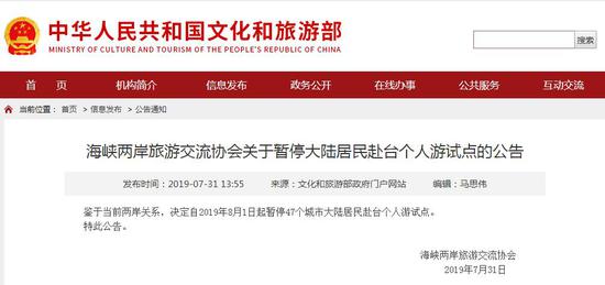 鉴于当前两岸关系,决定自2019年8月1日起暂停47个城市大陆居民赴台个人游试点。