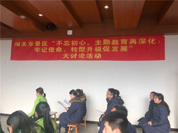 为全面贯彻落实习近平总书记重要讲话精神和党中央决策部署,扎实深入开展“不忘初心、牢记使命”主题教育,认真贯彻“创新、协调、绿色、开放、共享”五大发展理念,促进企业内部提升转型升级,一关公司经过前期的精心筹备策划、全员部署动员大会,于10月29日开始,公司各部门、各景区运营部、阁轩公司相继展开了“不忘初心,主题教育再深化;牢记使命,转型升级促发展”大讨论活动。