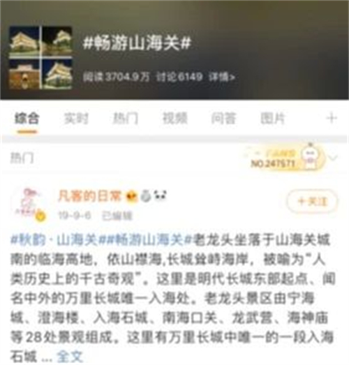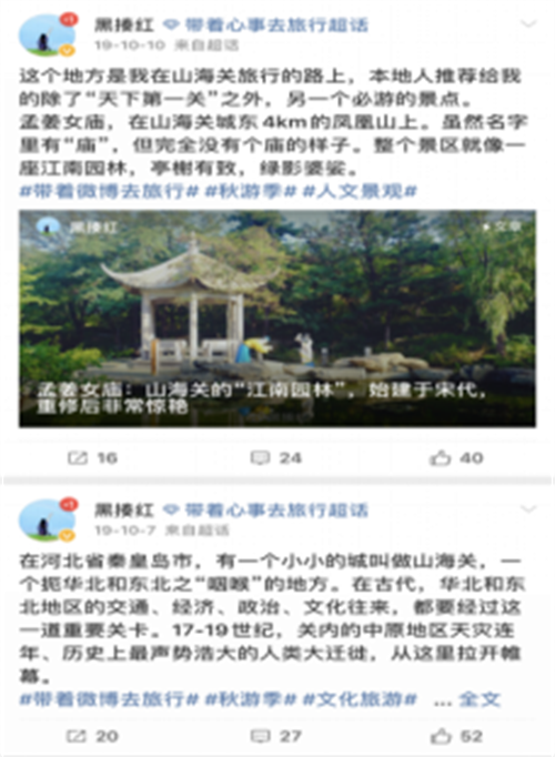邀请旅游达人来山海关进行深度旅游体验,将亲身实感及时在各网络平台上以讯息发布、视频播报、美图分享、旅游攻略的形式在传播落地推广。累计推文315篇,热门单篇最高阅读量达200余万次。