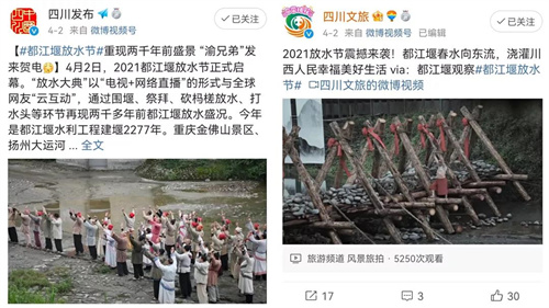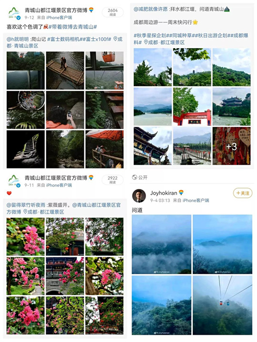 2021年,青城山—都江堰景区官方微博所主持#带着微博去都江堰#、#带着微博去青城山#等话题总阅读量约5000万。