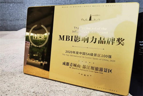 2021年9月15日,由迈点研究院 迈点网主办的文旅2020——中国文旅景区MBI品牌盛典在杭州市召开,青城山—都江堰景区荣获“中国5A级景区品牌影响力100强”大奖。