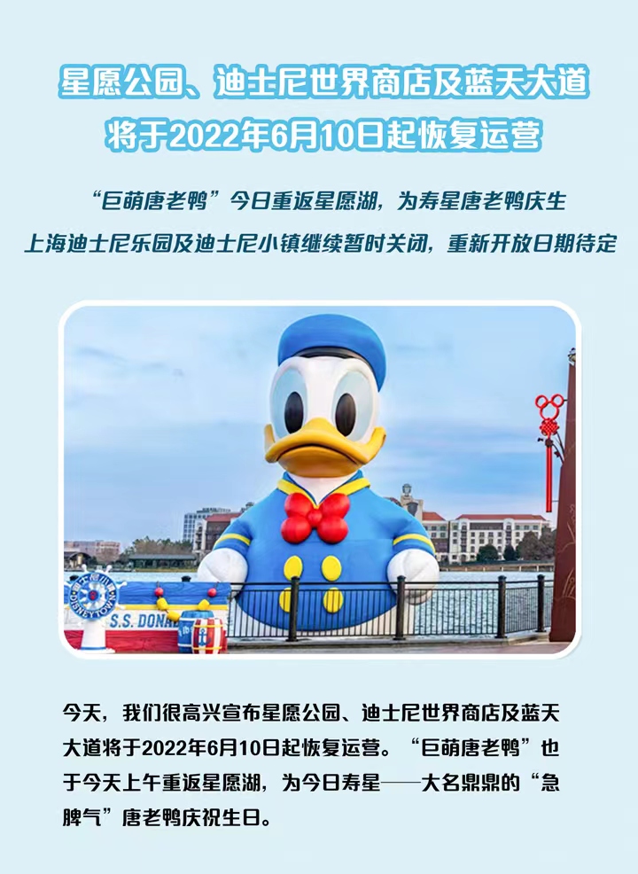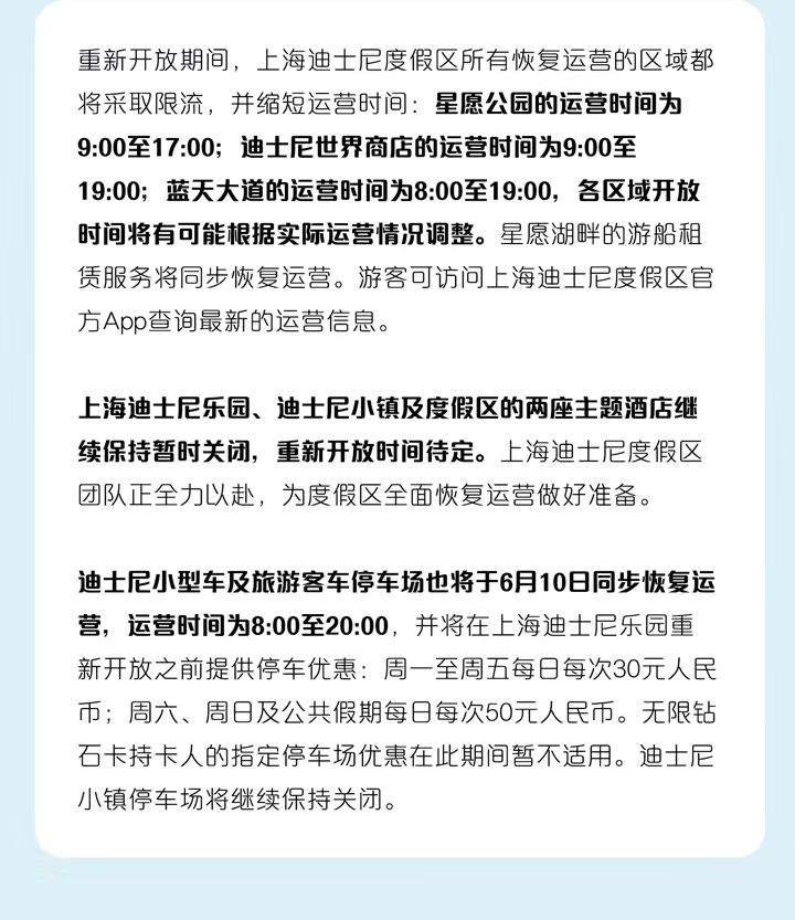 据“上海迪士尼度假区”公众号消息,星愿公园、迪士尼世界商店及蓝天大道将于6月10日起恢复运营。上海迪士尼乐园、迪士尼小镇及度假区的两座主题酒店继续保持暂时关闭,重新开放时间待定。开放期间,所有已开放区域将限流运营;所有游客均须持有绿色“随申码”以及72小时内核酸检测阴性证明方可进入上海迪士尼度假区。