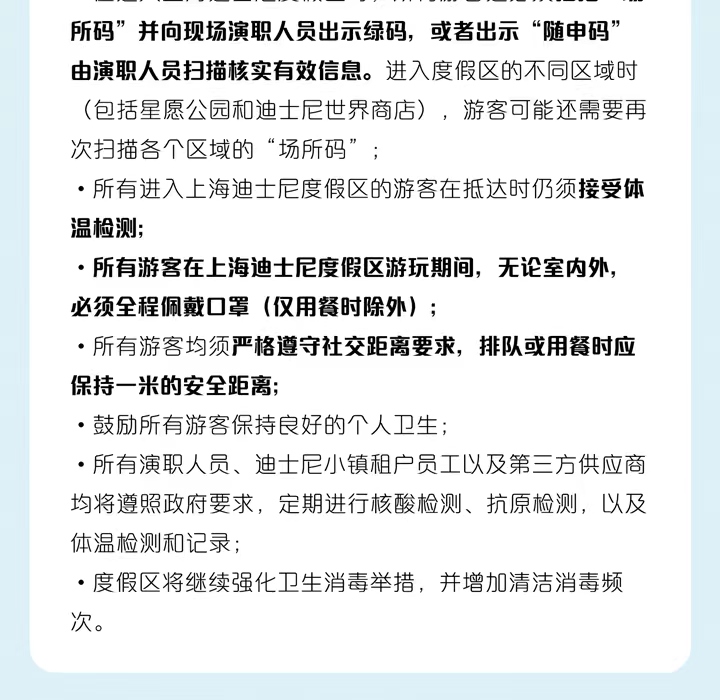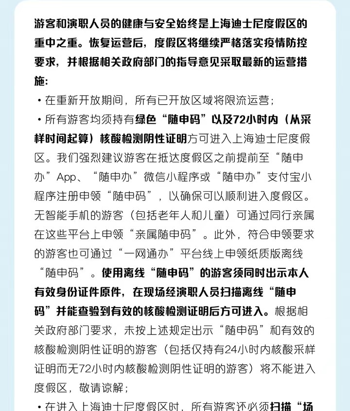 所有游客均须持有绿色“随申码”以及72小时内核酸检测阴性证明方可进入上海迪士尼度假区。