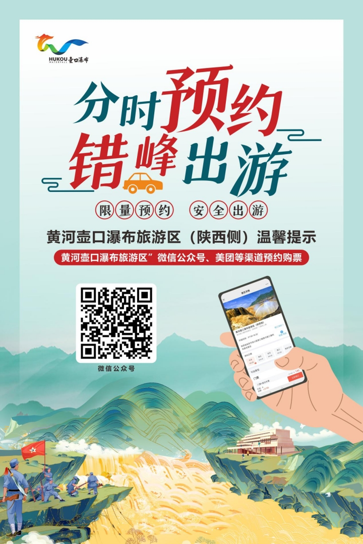为积极应对”五一“假期旅游高峰,黄河壶口瀑布旅游区(陕西侧)深入贯彻“A级旅游景区要严格落实“限量、预约、错峰”要求,落实门票预约制度”,节日期间,实行全员实名、分时预约购票。游客朋友们可通过“黄河壶口瀑布旅游区”微信公众号、美团等渠道预约购票,每日预约限额与最大接待量为3万人次。广大游客需严格按照预约时间段有序进入检票区域。