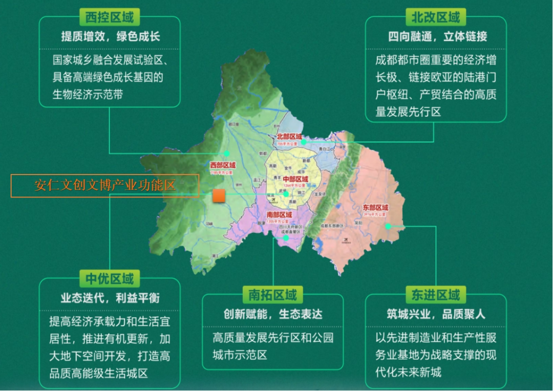 安仁镇距离成都中心位置42公里、大邑县城8公里、双流国际机场38公里、成都西站39.6公里,处于成温邛高速公路和川西旅游环线上。其地理区位为成都市国土空间规划中的西控区域,属于城市农村融合发展试验区,也是成都市文化旅游功能区、文创类功能区和文博产业的聚集之地。