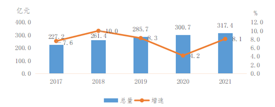 2021年,大邑县实现地区生产总值317.40亿元,按可比价格计算比上年增长8.1%。其中,第一产业增加值34.05亿元,增长6.1%;第二产业增加值131.35亿元,增长8.4%;第三产业增加值152.00亿元,增长8.5%。三次产业对经济增长的贡献率分别为11.9%、39.9%和48.2%。三次产业结构为10.7:41.4:47.9,第三产业对于经济增长具有显著驱动作用。