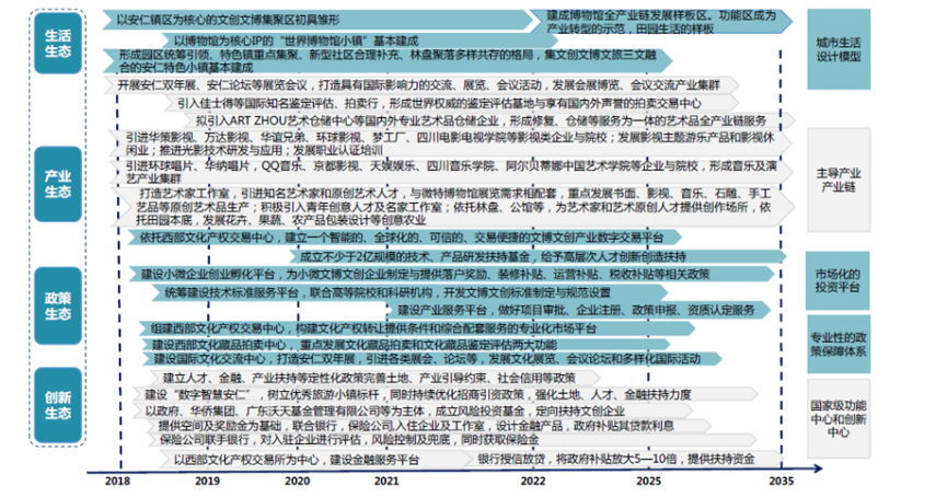 按照《成都市产业发展白皮书》的要求,文博文创产业园区的核心区域将在2020年建成,博物馆业产业增加值达到五十亿元以上,并逐步建立起一个完整的产业链。具体地,2020年实现引进65家以上的博物馆和5家上市的文创公司,以及百亿元以上的旅游总收入。到2035年,实现全市博物馆产值增量210亿元以上,累计引进博物馆100家以上、上市文创企业10家以上,实现旅游总收入500亿元以上,打造一个全面发展的产业链样板区。