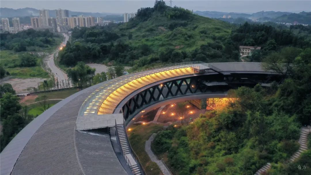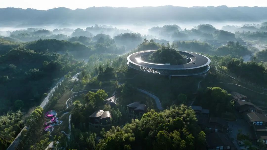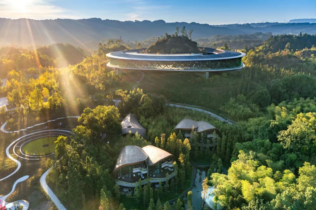 在文旅消费提质转型升级的新趋势下,深入贯彻落实景城乡一体化发展战略,高标准高起点启动大观原点项目规划建设。大观原点的规划设计,参照了明代画家周臣创作的《春山游骑图》,中国建筑设计研究院在中国传统山水画中找灵感,保留中国化的原乡原味,最大限度保地形地貌与自然植被,力求人与自然和谐统一。依托大观园独特自然禀赋和深厚文化底蕴,始终坚持“绿水青山就是金山银山”发展理念,最大限度保留原有山石林田等自然本底,采用超大圆形钢结构绕山而建,让建筑与自然完美融合,塑造了“内观青山、外观花海”景观格局,用艺术手法将绿水青山转化为文旅精品!被授予2020年度GBA金像(绿色建筑与绿色建材创新发展奖)“最佳绿色建筑施工”荣誉及中国钢结构金奖。同时,大观原点也获评“重庆乡村振兴十大示范案例”,成为全国乡村旅游精品线路“新地标”,更成为我区景城乡融合发展的重要支撑和农文旅融合、一二三产互动的强力引擎。大观原点以原乡文化、农耕文化为内核,涵盖游客中心、特色商业街、精品酒店、乡野民宿、自然剧场、农事体验场等业态,其原乡原味特色、创新功能定位、混改经营模式、示范带动作用等得到各界好评。