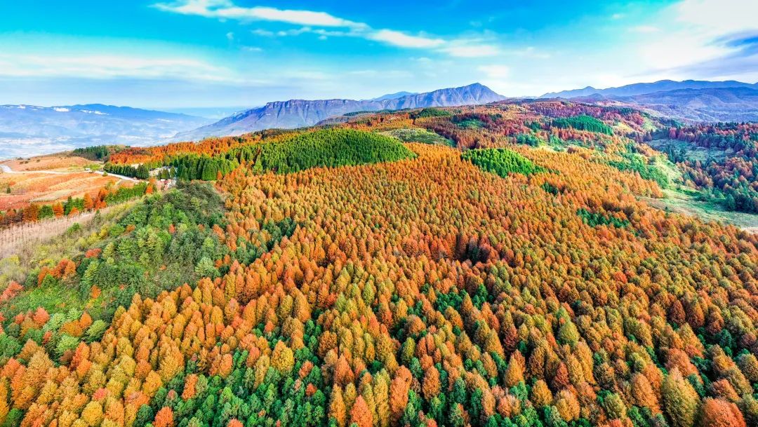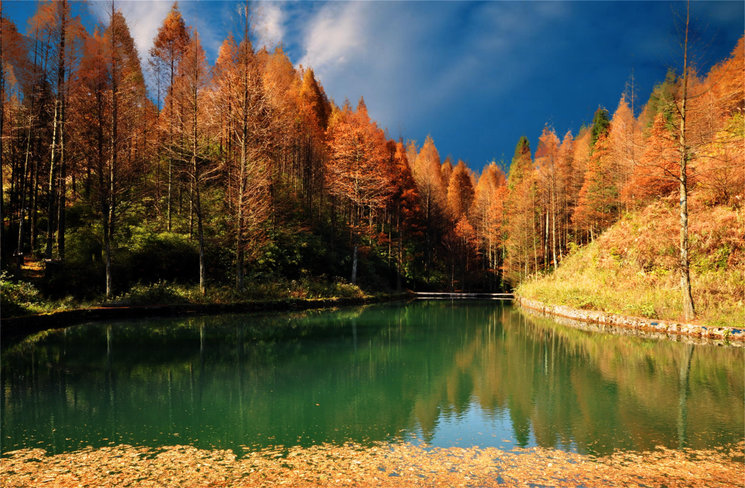 十一月深秋时节,水杉、柳杉、银杏与种类繁多的珍稀植物,纷纷变幻妆色,金黄、橘红、胭脂、蓝紫、青碧、油绿……点缀出春夏秋冬不一样的色彩,漫山遍野,五彩斑斓,美仑美奂。