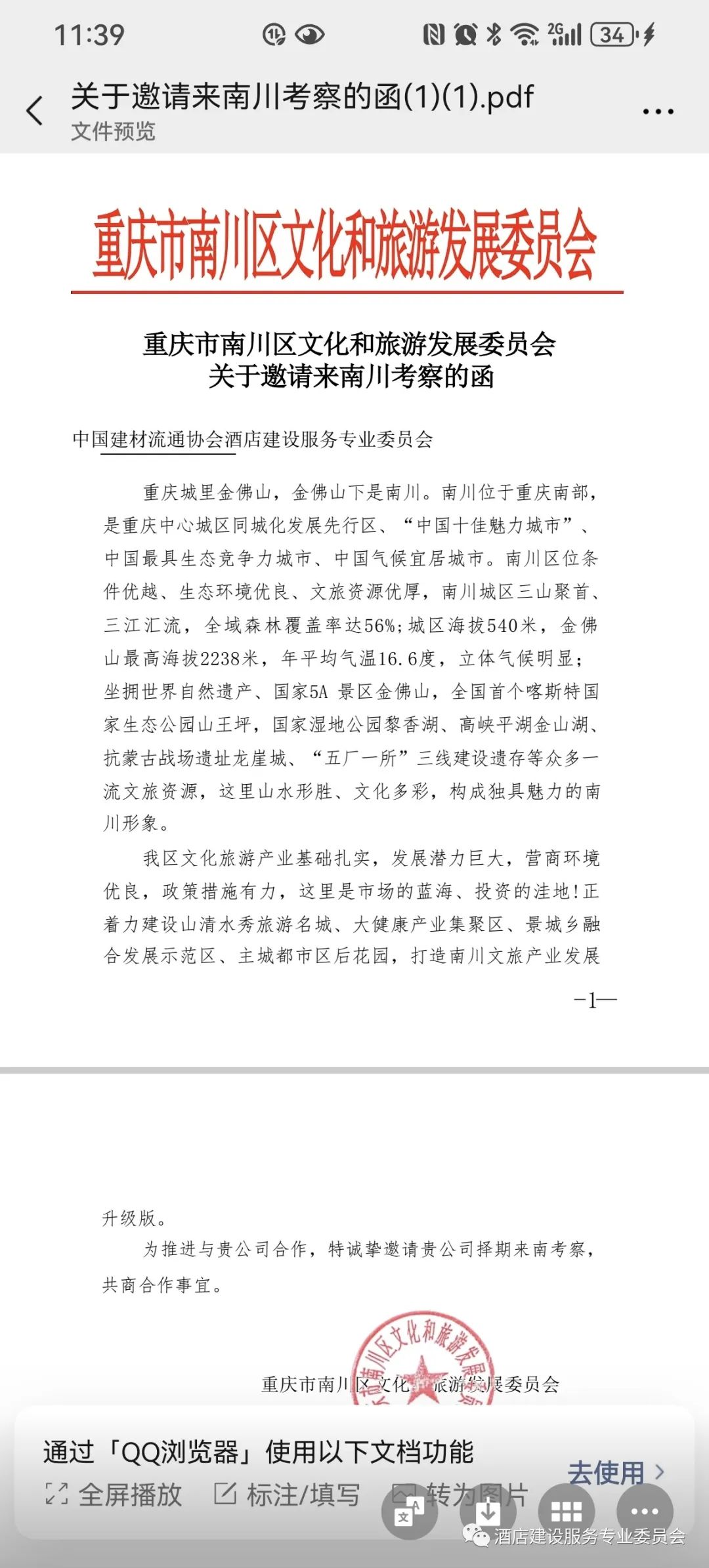 2023年10月30-11月2日,美丽的金秋旭日金光,鸟语花香!应重庆南川区文旅委官方特邀,中国建材流通协会酒店建设服务专业委员会主席兼秘书长陶舰携常务副秘书长魏巍及文旅集团平台企业,酒店文旅知名投资业主,第三方管理公司,知名设计企业,国际知名酒店品牌雅高集团,洲际集团和国内头部品牌锦江中国等标杆品牌企业董事长,总裁和总经理一行15人来到美丽的重庆后花园拥有世界遗产的南川专题高级文旅考察行,合作共赢,共兴中国酒店文旅业,得到重庆南川区委,区政府,区委宣传部,人大,文旅委,区城投集团,文投惠农集团领导高度重视,亲自接待和陪同参观考察,专业研讨交流,项目考察,南川优秀的文旅资源,高水平的基础设施投入和生态保护品质,178环线世界级品质的生态景观,给考察团各位代表留下深刻印象,绿水青山就是金山银山!未来充满希望和活力的重庆及南川文旅必将大放光彩,吸引国际国内宾朋及高水平文旅品牌,企业入驻,再创辉煌!