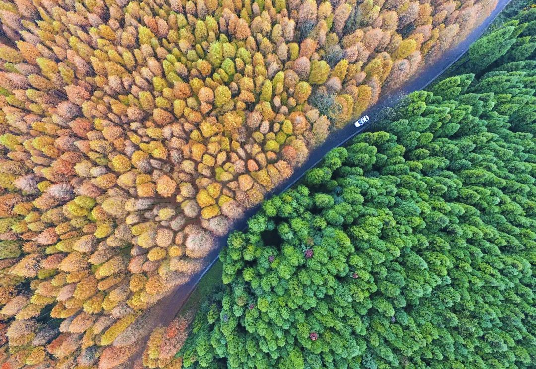其中的核心景区双色彩杉林,是有名的美景打卡地。8000亩水杉与柳杉,隔着蜿蜒绵长的公路,笔直挺立、相对守望,一半水杉黄、一半柳杉绿,界线分明,交织出“半山秋色半山春”的壮丽诗篇,美得惊心动魄。