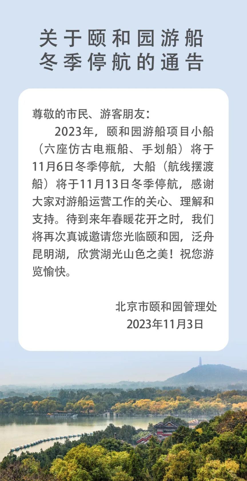 近日,北京颐和园官方微信发布游船冬季停航相关通告。颐和园游船项目小船(六座仿古电瓶船、手划船)将于11月6日冬季停航,大船(航线摆渡船)将于11月13日冬季停航。
