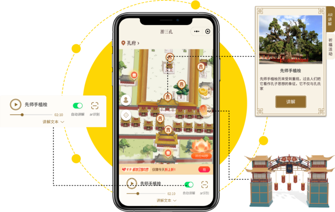 在整个游览过程中,不仅设置了智能数字导览还增加了AR内容互动。游客根据语音提示,打开小程序AR相机扫描提示物体即可获得不一样的互动体验。游客不仅可以线上AR祈福还可以体验孔子杏坛讲学的乐趣,提升了游客对景区历史文化的感知,增添游览过程中的趣味性和沉浸性。