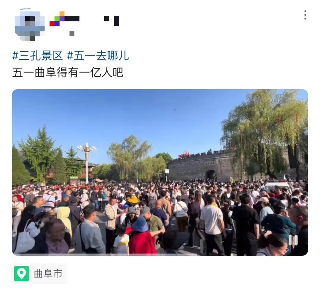 “五一曲阜得有一亿人吧”。小长假首日,一位游客发布游览三孔景区场面视频时这样表示。