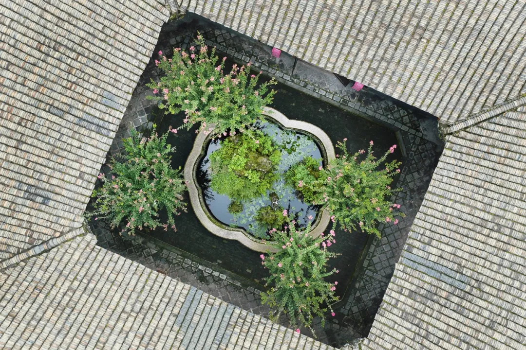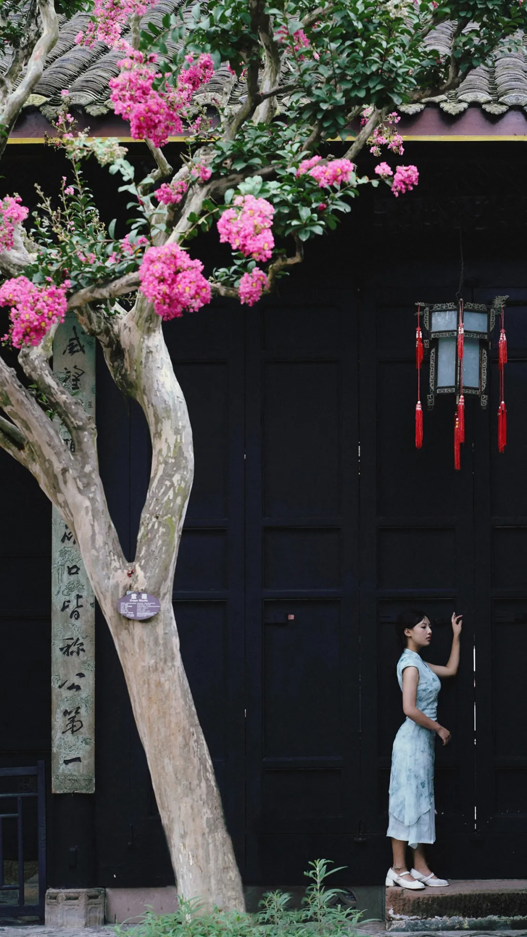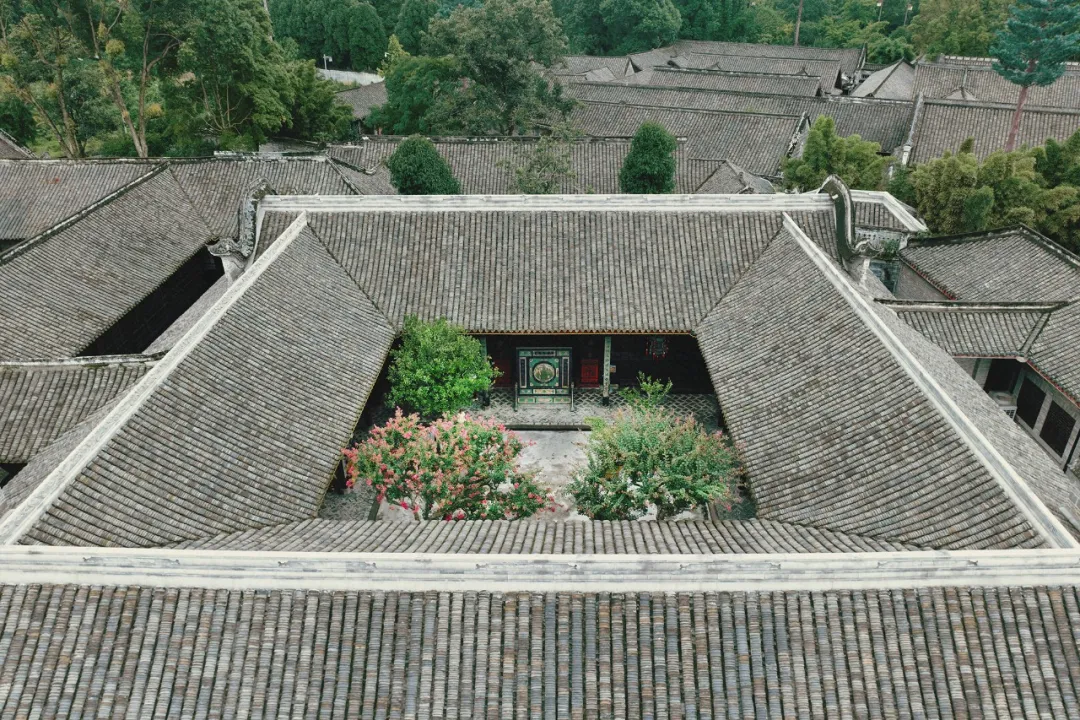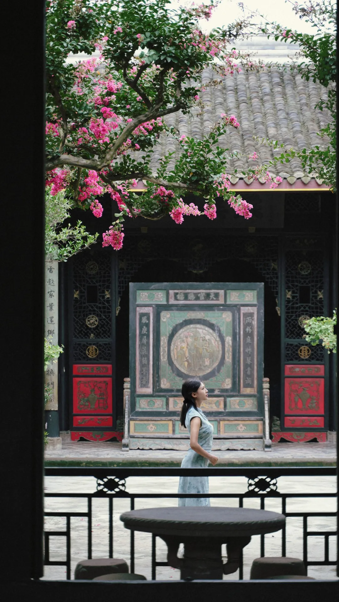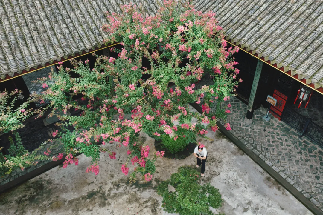 在安仁古镇的刘氏庄园的四方小院中紫薇花与民国风的建筑相得益彰深色的民国风大门和古朴的屏风与明艳的紫薇花相互映衬是盛夏不可多得的浪漫
