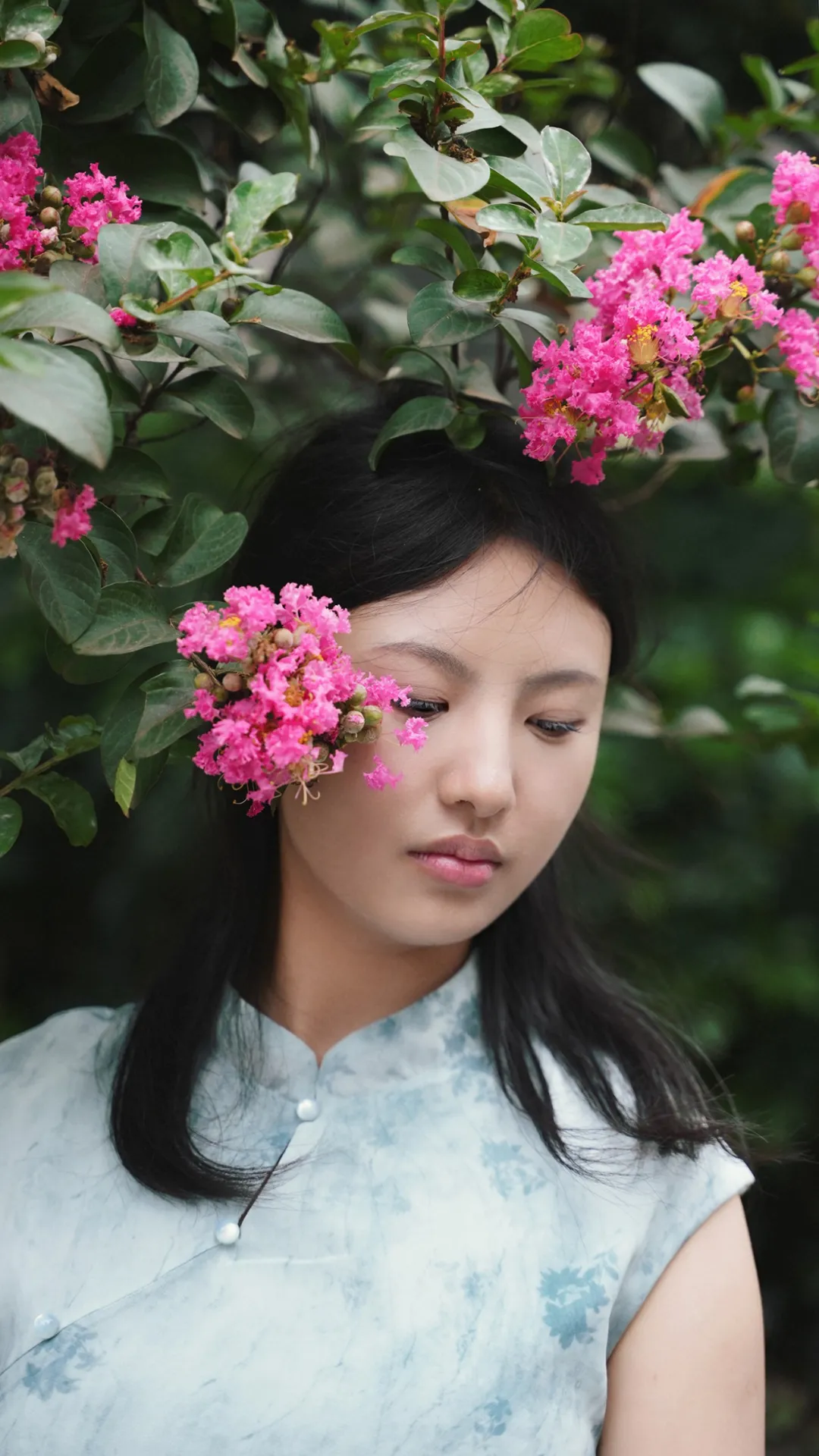 一方小院,一株紫薇远望恍若天边晴霞织锦,缤纷绚丽近观花骨如绣,轻盈柔美让人心旷神怡,忘却尘嚣撑一把油纸伞,站在紫薇树下