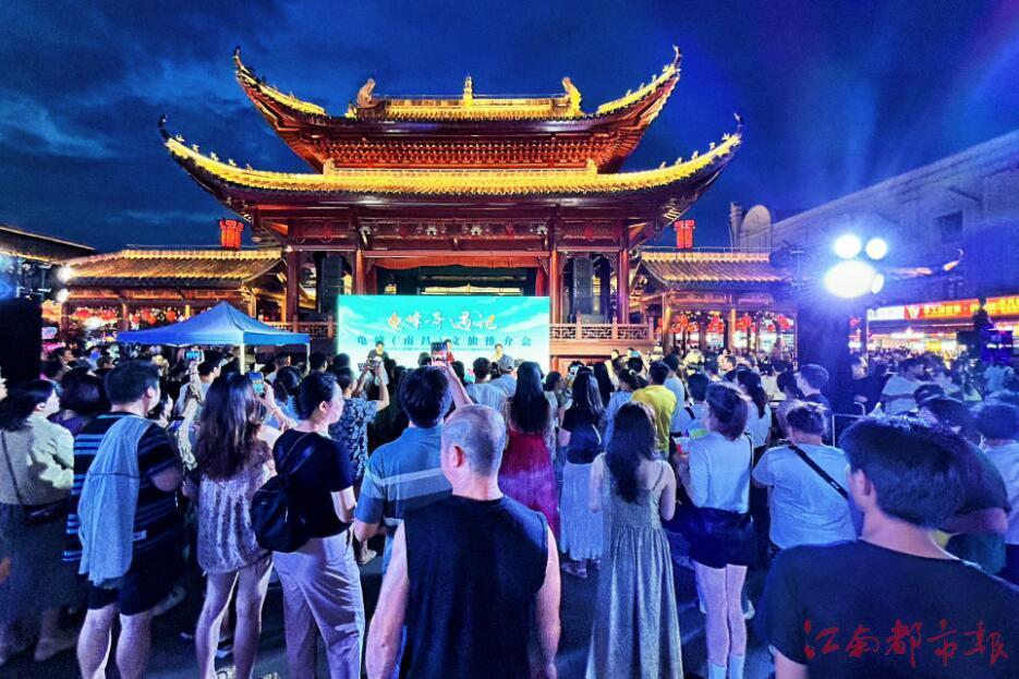 夜幕降临,主办方又在南昌火热的万寿宫商圈举行了“龟峰奇遇记”户外路演活动。活动现场布置新奇有趣,情景演绎NPC互动、民俗活动体验、特色市集等丰富多彩的体验活动,让游客们赞不绝口。特别是情景演绎环节,通过生动的表演和互动,让游客们仿佛穿越时空,亲身体验了弋阳的历史文化和风土人情。民俗活动体验区则让游客亲手尝试制作传统手工艺品,品尝地道美食。特色市集则汇聚了弋阳的各类特色商品和美食,让游客们在购物和品尝中进一步了解弋阳的丰富多样。