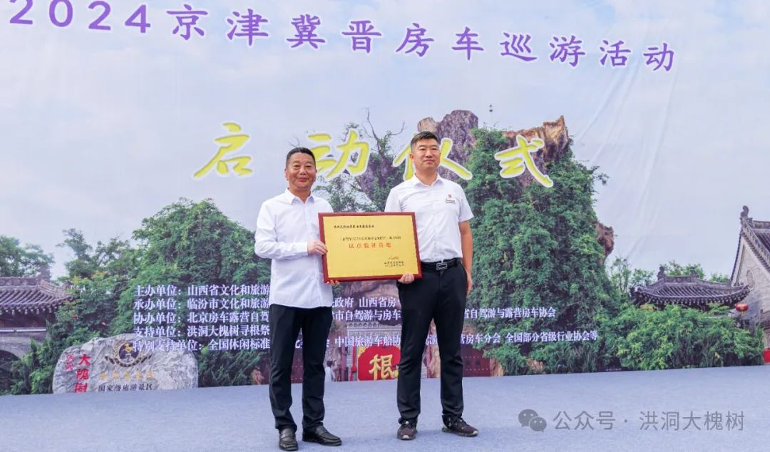 随后,山西省房车协会会长董瑞江为大槐树房车露营基地授予“试点验证营地”。董瑞江会长在授牌仪式上表示,大槐树房车露营基地具备得天独厚的自然条件和完善的设施,是房车爱好者的理想之选。此次授牌,既是对大槐树房车露营基地的高度认可,也是对山西省房车旅游产业发展的有力推动。山西省文化和旅游厅副厅长陈少卿、临汾市文化和旅游局副局长马春雷与王欣副县长分别向山西省房车协会黄河、长城、太行三组线路代表授旗。这一庄严的授旗仪式,标志着本次房车巡游活动正式启动。陈少卿副厅长在授旗仪式上强调,黄河、长城、太行是山西省的三大文化旅游品牌,也是山西省文化旅游产业发展的重要支撑。此次房车巡游活动将沿着黄河、长城、太行三条线路展开,旨在深入挖掘山西省的历史文化和自然风光资源,推动山西省文化旅游产业高质量发展。洪洞县文化和旅游局局长柳丽娟、文物旅游中心主任张青龙、洪洞大槐树寻根祭祖园有限公司总经理王宏健、常务副总经理何东海等出席了启动仪式。