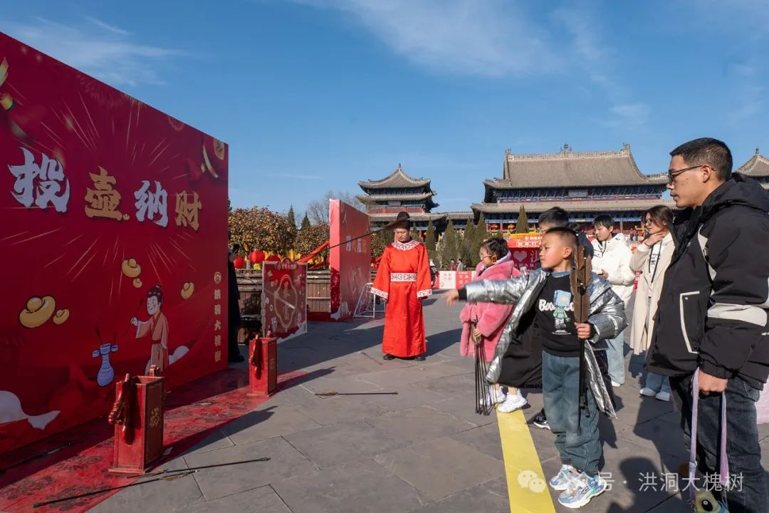 丰富多彩的民俗活动和深厚的文化底蕴,成为游客出行的热门打卡地。在景区祭祖广场上,“明朝科举汇”活动备受欢迎,投壶、蹴鞠、蒙眼敲锣等活动热闹非凡。许多小朋友们在家长的带领下踊跃参加,沉浸式领略古代科举的独特魅力,在欢乐中感受传统文化的熏陶。民俗村内,《铁锅记》《街头卖艺》《不倒翁》《快闪秀》等互动性表演接连上演,现场氛围热烈,游客们不仅能够欣赏精彩演出,还能亲身参与其中,与演员进行互动,尽情感受浓厚的节日氛围。
