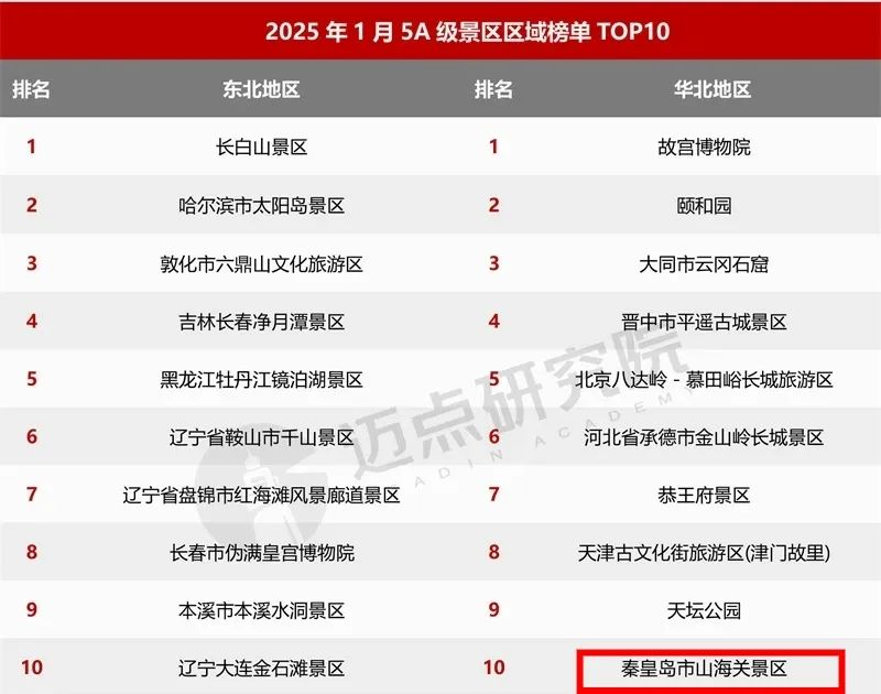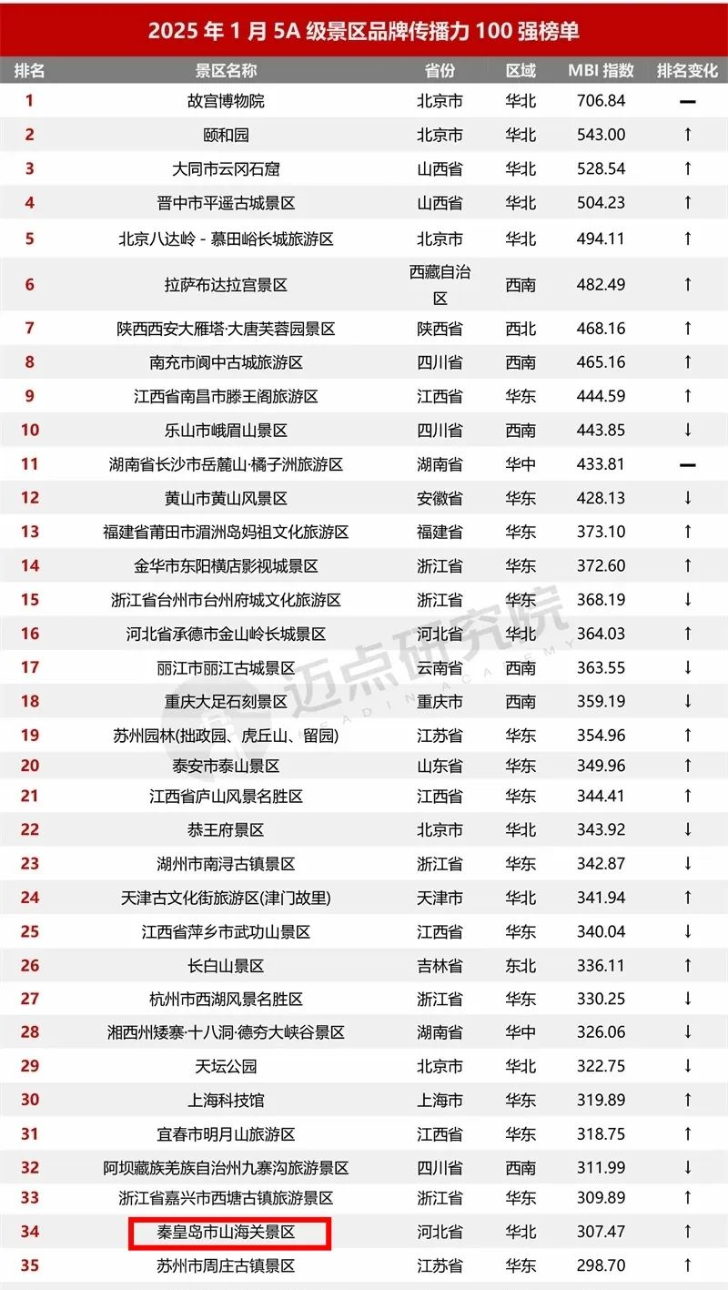 2025山海关景区开门红!迈点研究院发布的1月5A级景区品牌传播力100强榜单中山海关景区跃居第34位!区域榜单华北地区TOP10!