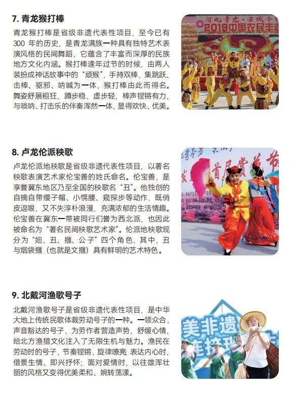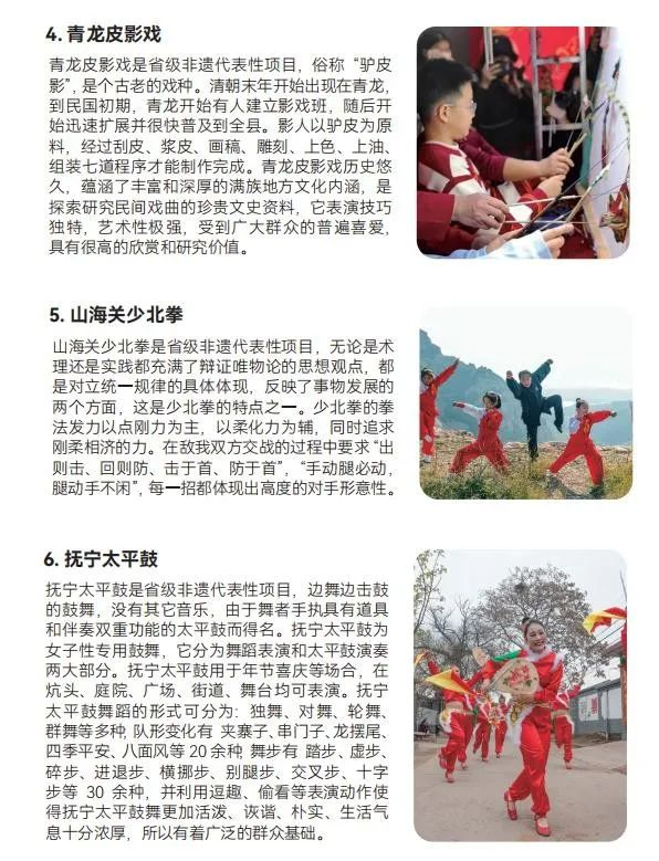 22.省级非遗——皮影戏青龙皮影戏被俗称为“驴皮影”,是个古老的戏种,于清朝末年开始出现在青龙。到民国初期,青龙开始有人建立影戏班,随后开始迅速扩展并很快普及到全县。影人以驴皮为原料,经过刮皮、浆皮、画稿、雕刻、上色、上油、组装七道程序才能制作完成。青龙皮影戏历史悠久,蕴涵了丰富和深厚的满族地方文化内涵,是探索研究民间戏曲的珍贵文史资料,它表演技巧独特,艺术性极强,受到广大群众的普遍喜爱,具有很高的欣赏和研究价值。