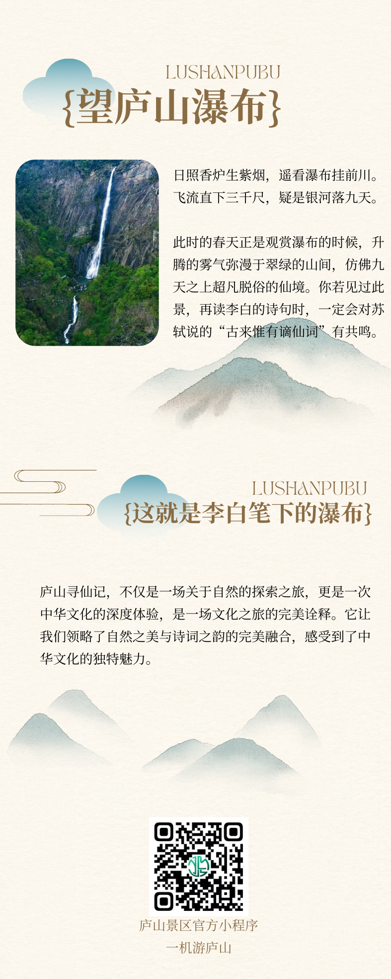 庐山作为中国田园诗的诞生地,中国山水诗的发源地,自古以来就有“匡庐奇秀甲天下山”的美誉。吸引了陶渊明、李白、白居易等文人墨客留下传世诗篇。春日庐山,山间云雾缭绕,草木葱茏,桃李争艳,杜鹃烂漫,形成一幅诗意的画卷。