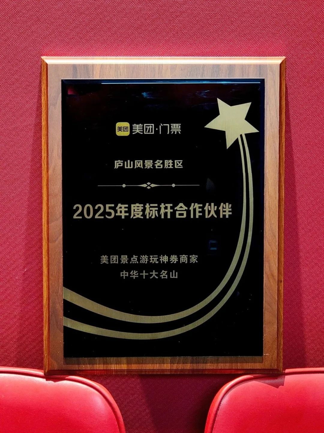凭借此前创新的营销理念与高效的资源整合能力,庐山风景区荣获 “美团 2025 年度标杆合作伙伴” 称号。